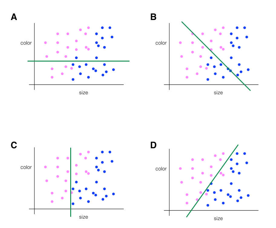 假设你想分离两种类型的图像数据:自行车和汽车的图像。你可以查看每幅图像的颜色和车辆的外观尺寸,并将这些数据绘制在一张图上。鉴于以下几点(粉红色的点是自行车,蓝色的点是汽车),你会如何选择分离这些数据?