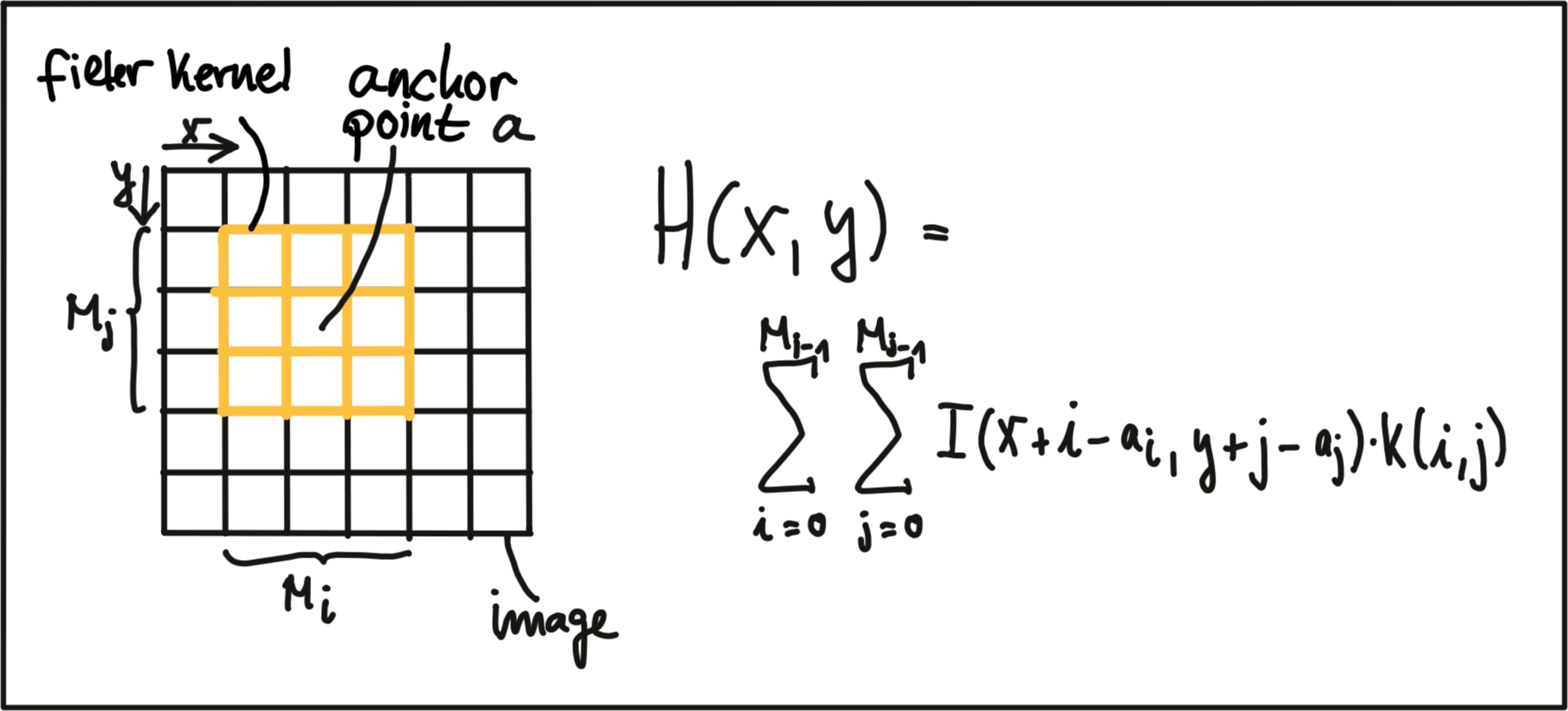 - Define the anchor point within the kernel (usually the center position) and place it on top of the first pixel of the image.