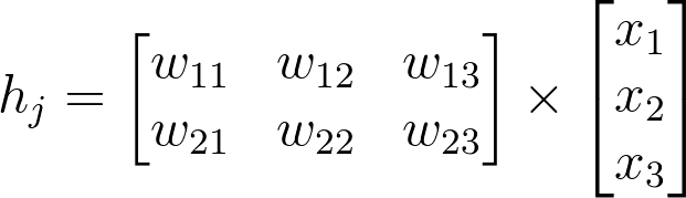 This creates a 2D array (i.e. a matrix) named weights_input_to_hidden with dimensions n_inputs by n_hidden. Remember how the input to a hidden unit is the sum of all the inputs multiplied by the hidden unit's weights. So for each hidden layer unit, h_j, we need to calculate the following: