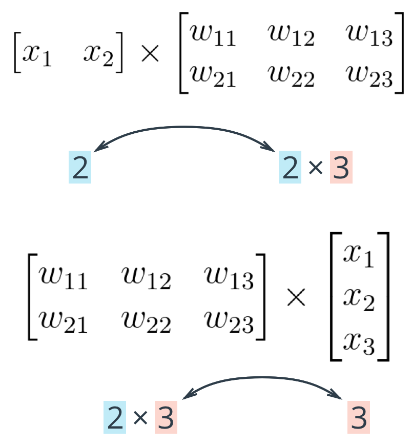 The important thing with matrix multiplication is that the dimensions match. For matrix multiplication to work, there has to be the same number of elements in the dot products. In the first example, there are three columns in the input vector, and three rows in the weights matrix. In the second example, there are three columns in the weights matrix and three rows in the input vector. If the dimensions don't match, you'll get this: