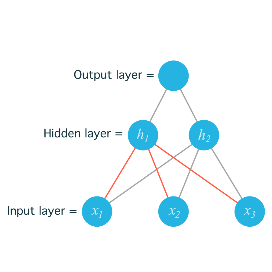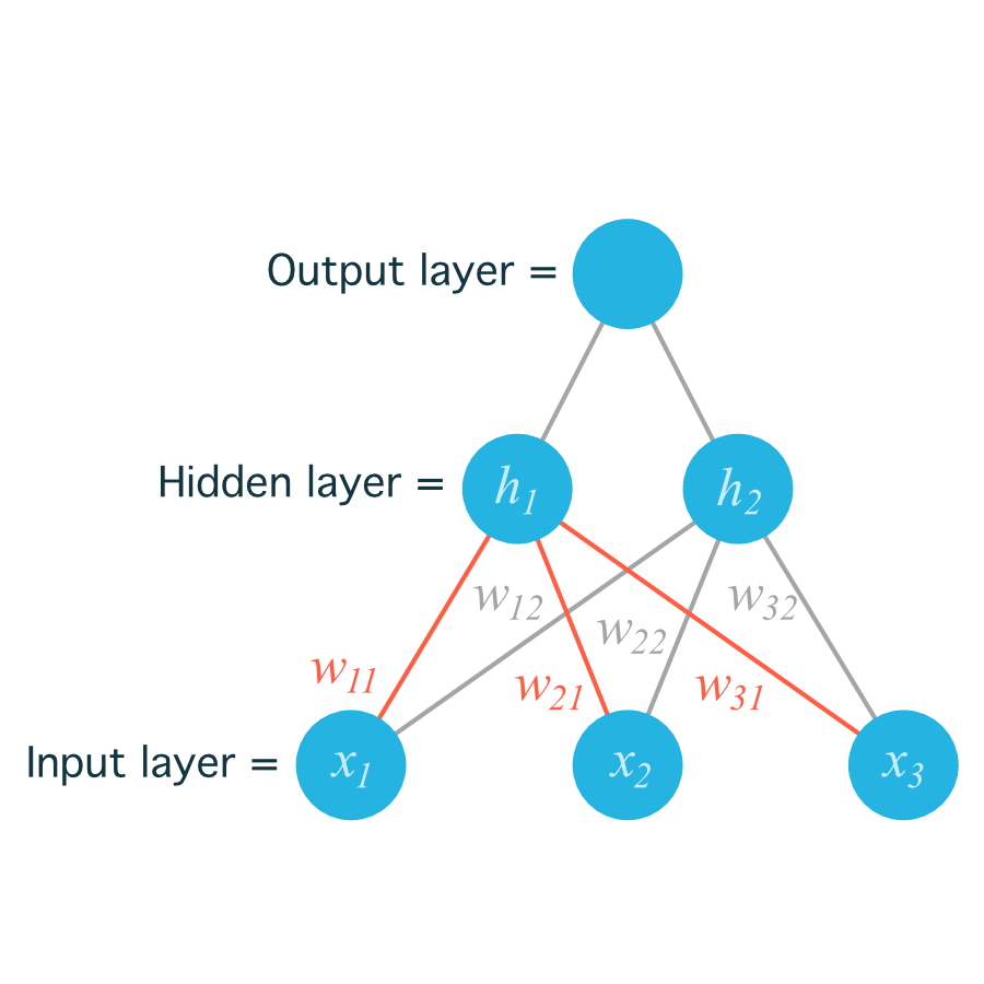 For example, the following image shows our network, with its input units labeled x_1, x_2, and x_3, and its hidden nodes labeled h_1 and h_2: