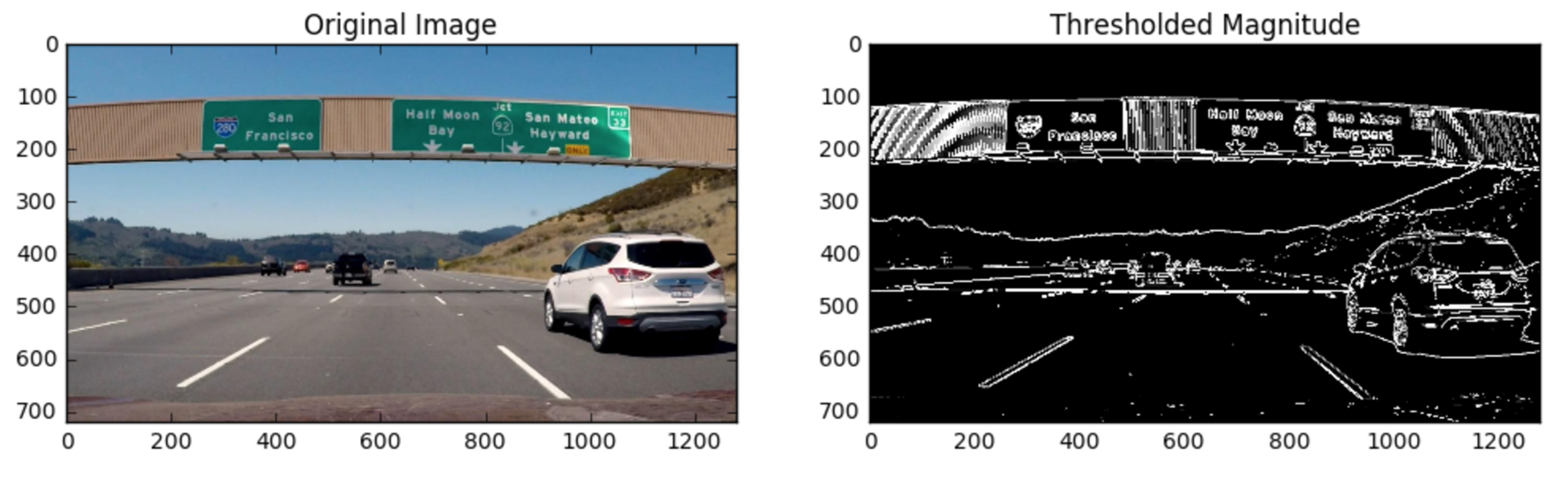 - Fill out the function in the editor below to return a thresholded gradient magnitude. Again, you can apply exclusive (