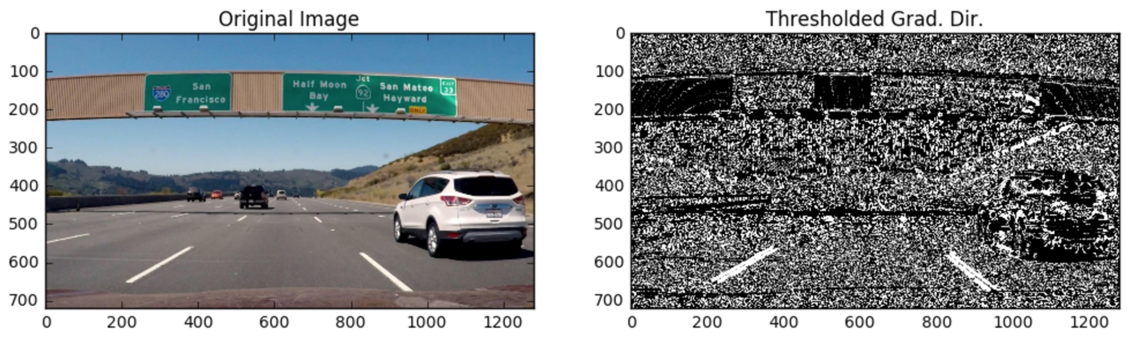- Fill out the function in the editor below to return a thresholded absolute value of the gradient direction. Use Boolean operators, again with exclusive (