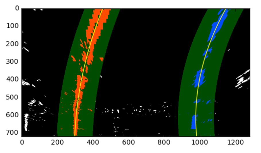 To implement this in the below quiz, you'll want to grab only those pixels with x-values that are +/- your margin from your polynomial lines. Note that you'll only need to implement left_lane_inds and right_lane_inds in the quiz - most of the surrounding code, ignoring iterating through the windows, is the same as before!