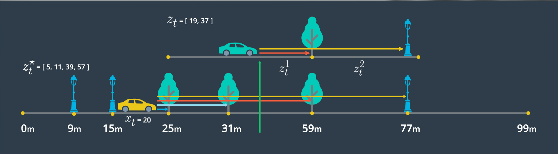 For the figure below, the top 1d map (green car) shows our observation measurements. These are the distances from our actual car position at time t, to landmarks, as detected by sensors. In this example, those distances are 19m and 37m.