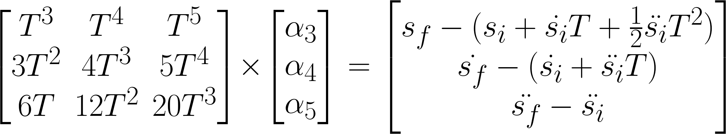 start- [s_i, \dot{s_i}, \ddot{s_i}]end- [s_f, \dot{s_f}, \ddot{s_f}]T- the duration of maneuver in seconds.